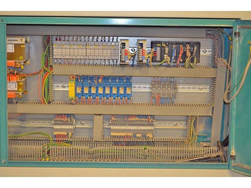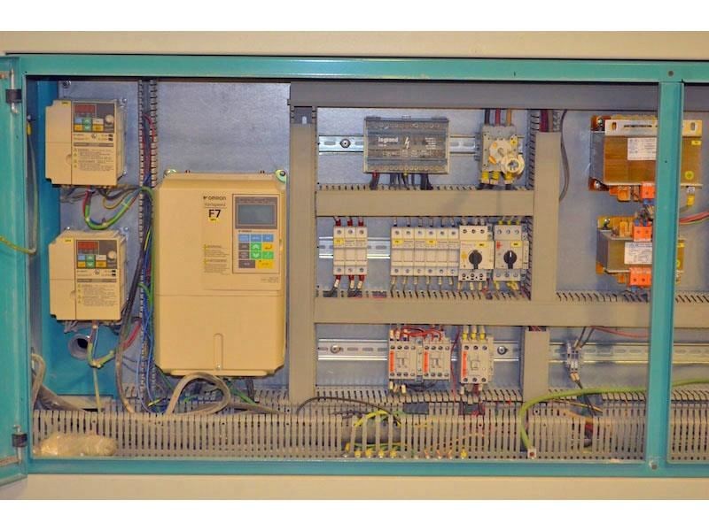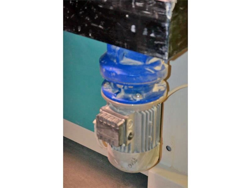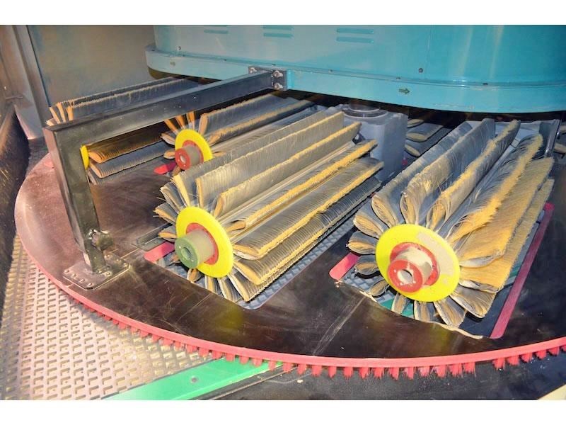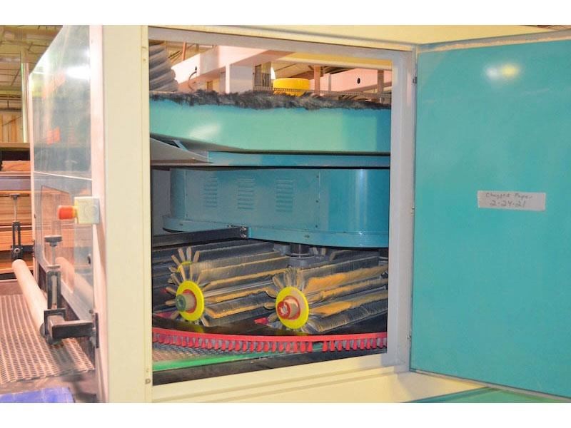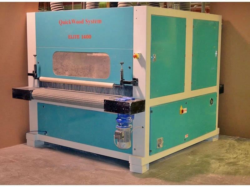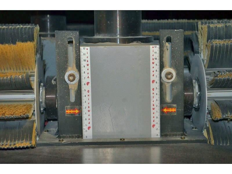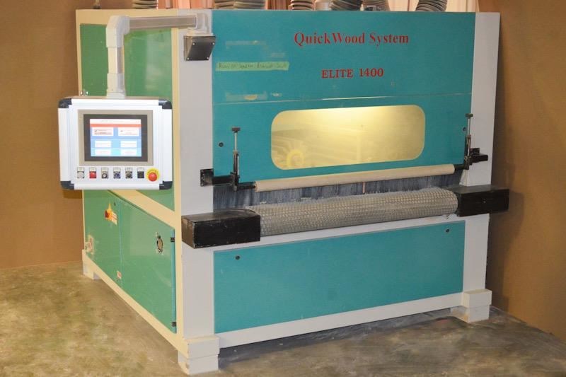 QUICKWOOD ELITE-1400 Denibbing Sander with (8) Abrasive Brush Heads; (1) 8-Head carousel with brush loadings, 55" max. width - for finish & sealer sanding.Equipped with and Specifications: -- (1) Carousel head with (4) double arbor, opposing heads consisting of (8) counter-rotating spindles. -- Heads on each side are staggered left/right and center mounted for carousel operation. -- Each double arbor powered by 2 HP motor, variable spindle speed from 300 to 1,150 RPM, inverter powered and controlled from Operator panel, 21-1/2" long spindles extend out each side of head drive. Features & Brush loadings: -- Carousel variable speed from 3 to 16 RPM, 2 HP drive motor, inverter controlled with keypad and LED readout. -- Spindles hold approx. (344) discs or a combination of QUICK abrasive discs, nylon brushes, or nylon impregnated discs. 14" Max. disc dia., brush loadings mounted on a slight angle to create an oscillating motion. Feed System & Speed: -- "Vactronic" Vacuum bed conveyor feed system, (2) 10 HP vacuum fan assembly, variable feed speed from 6 to 36 FPM, 2 HP feed drive. -- 0" to 4" Motorized thickness opening inverter controlled with keypad and LED readout. Features hold-down brush plate. Complete with & Includes: -- Full sound enclosure, 11 kW frequency inverter, (6) 5-1/2" dia. dust collection outlets, reversible head rotation, Flexi-heads. Operator Control panel with color monitor at eye-level height swivels on swing arm.