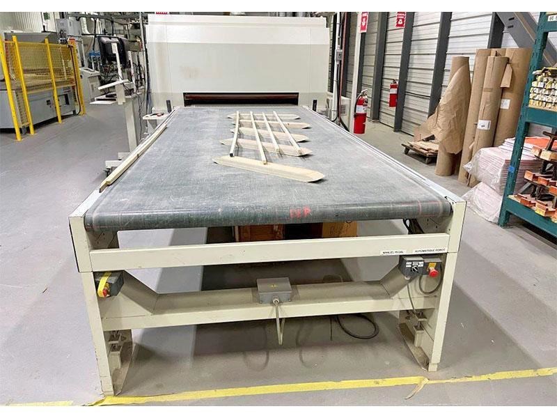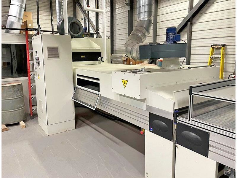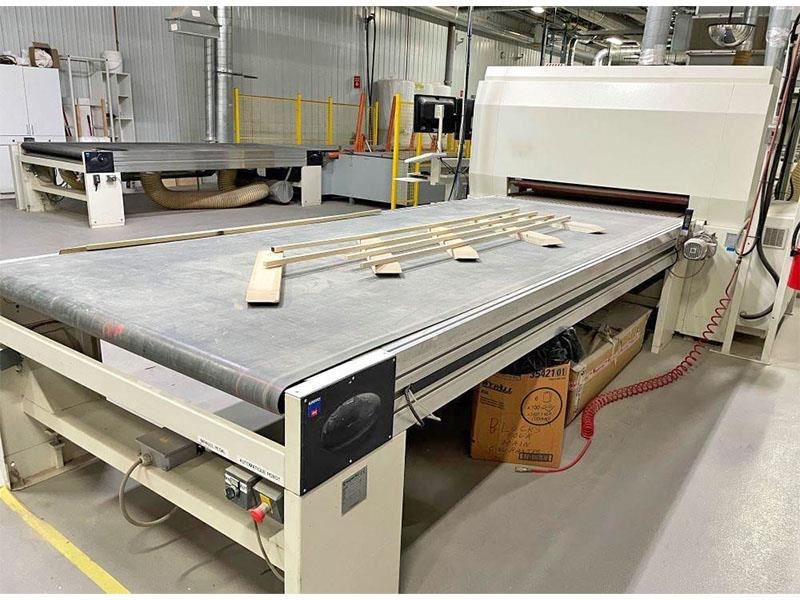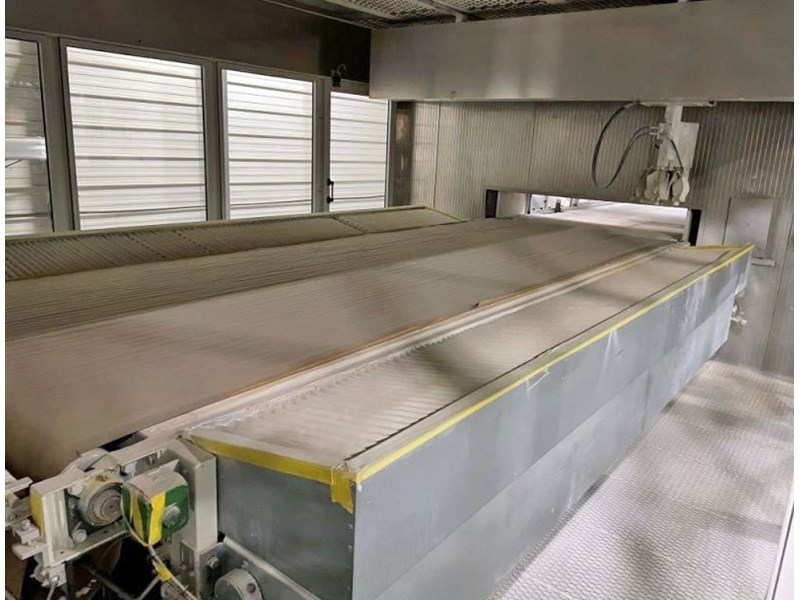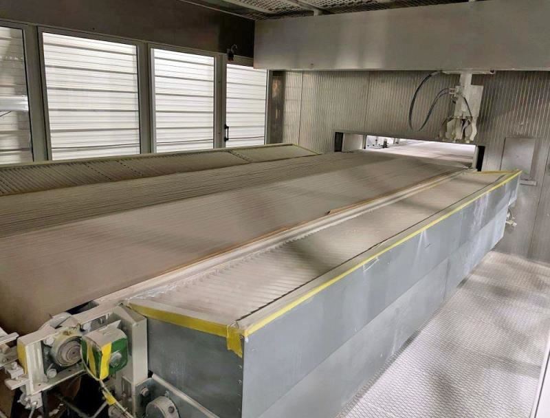 SUPERFICI BRAVOROBOT Complete Spray LineThis line consist of Sanding, brush cleaning, Robot sprayer, IR flash oven, Forced air dryer, Cooling off section, Panel turner and outfeed conveyorThis Robot can be used for 5 axis or flat line sprayingSpecifications: -- Part length: Minimum 12" Maximum 120" for panel and 144" for moulding -- Part width: Minimum 1", Maximum 51" -- Part Thickness: Minimum 1" , Maximum 4" -- Working height 900 mm +/- 20 mm (35 7/16") -- Feed speed 2-6 meter/min. -- Sprayer speed 40-140 Meter/min. -- Overall line dimensions 112' long X 40' wideLine Composition:1) Infeed conveyor2) Denibbing sander PROFICANDERr-C "Flextrim" (2) brush3) Belt conveyor for quality control4) Cleaning brush FV/SISAL/1 5) Infeed conveyor 6) Valtorta Bravorobot P1 with (4) guns for flat spraying and (1) 5 axis robot sprayer, Paper belt cleaning system7) Outfeed conveyor8) First drying tunnel flash off IRS Laminar Dryer 5M, Second section Hot air dryer with gas heating unit 6,000,ooo BTU9) Third drying zone with Hot Air10 Fourth drying zone with Air Blade with UV Lamp11) Cooling conveyor and quality control zone12) Doucet panel turner13) Outfeed belt conveyorNote The system has been professionally tear down and could be re-instal by the serme technician